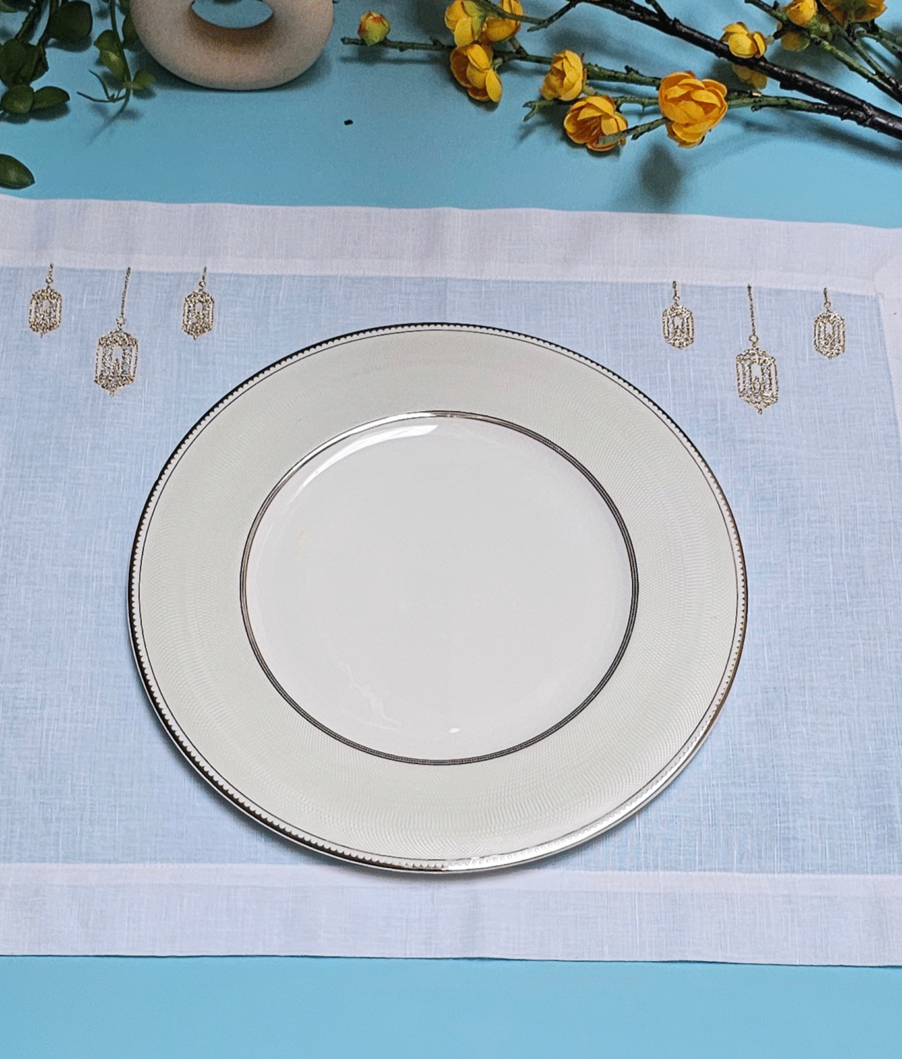 • premium white linen placemat embellished with delicate gold embroidery featuring lanterns, cresent moonsand stars- a graceful addition to your ramadan and eid table setting